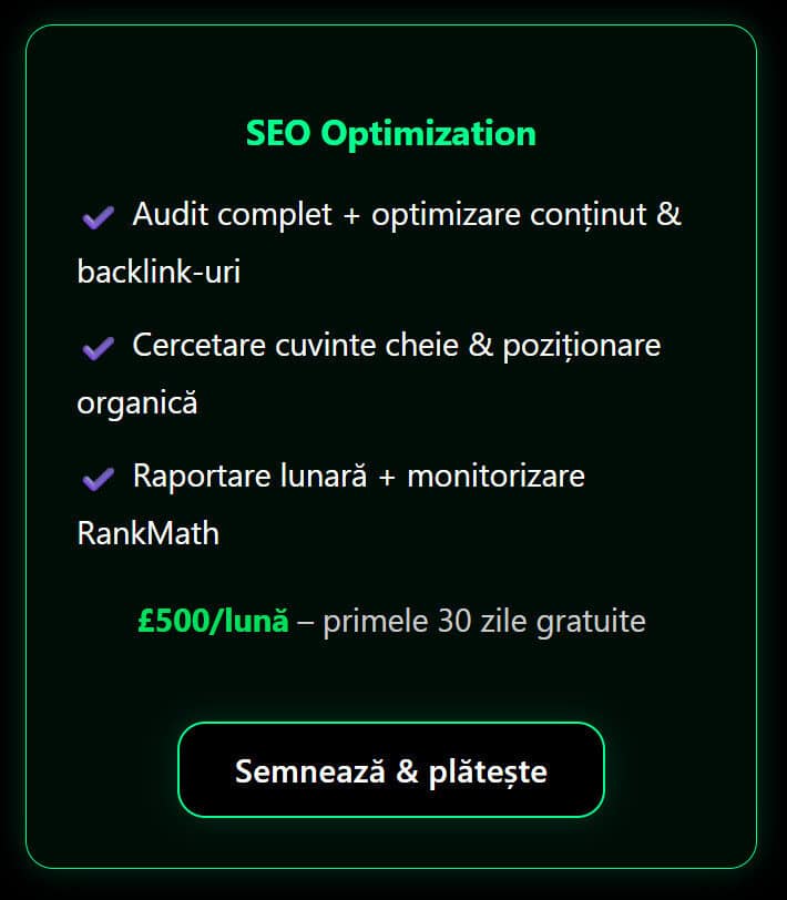 Acest serviciu include audit complet SEO, optimizare detaliată a conținutului, structură profesională a website-ului, corectarea erorilor tehnice, optimizarea cuvintelor cheie, îmbunătățirea poziționării organice și monitorizare lunară prin RankMath.